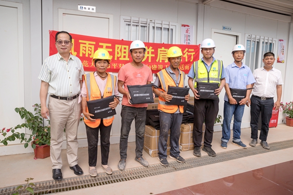 廈門恒興集團工會主席、學(xué)校項目后勤組組長洪超生代表學(xué)校籌建領(lǐng)導(dǎo)小組,向現(xiàn)場建筑工人贈送了雨衣,并向他們的辛苦付出表達了謝意。他表示,為了確保學(xué)校建設(shè)項目如期交付,工人們從去年12月開工以來始終堅守崗位,加班加點不辭辛苦,學(xué)校的一磚一瓦都凝結(jié)了他們的心血和汗水。作為學(xué)校建設(shè)方,希望盡可能地幫助工人解決后勤保障問題,改善工作條件,讓工人們切身感受到溫暖和關(guān)懷。隨著氣溫升高,夏季的防暑降溫物資也將陸續(xù)提供給現(xiàn)場作業(yè)人員。