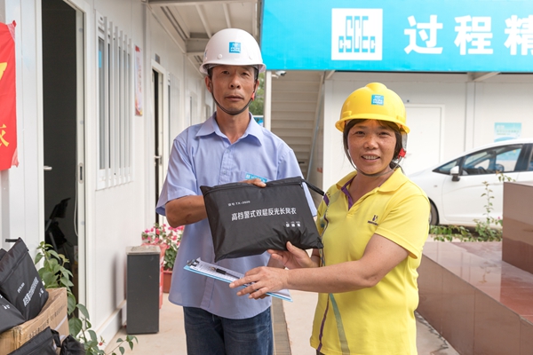 安全是項目建設(shè)的重中之重。對于一線建筑工人而言,雨天作業(yè)不僅增大了施工難度,也增加了危險系數(shù)。為此,華東師范大學(xué)希平雙語學(xué)校在雨季來臨之前,籌集了2000件雨衣,免費發(fā)放給施工現(xiàn)場的管理人員和各班組工人,在雨天等特殊作業(yè)環(huán)境下,為工人提供有效的健康和安全保障。