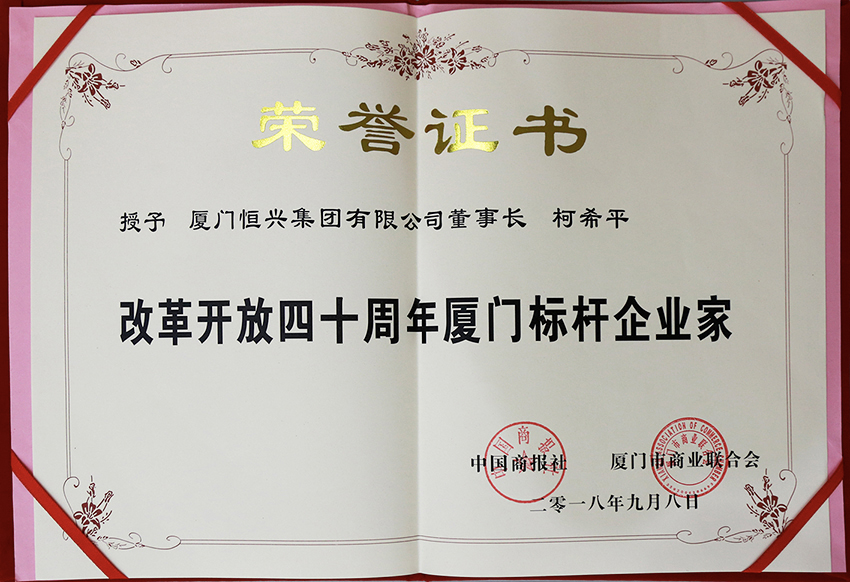 金秋迎盛會,改革促發(fā)展。9月8日,在第二十屆中國國際投資貿(mào)易洽談會開幕之際,中國商報社、廈門市商業(yè)聯(lián)合會攜手主辦的“改革開放四十周年廈門標(biāo)桿企業(yè)家、創(chuàng)業(yè)精英、助力品牌、創(chuàng)新品牌”推選活動在廈門舉行頒獎儀式,61家企業(yè)家和品牌獲得殊榮。廈門恒興集團柯希平董事長榮獲“改革開放四十周年廈門標(biāo)桿企業(yè)家”榮譽稱號。