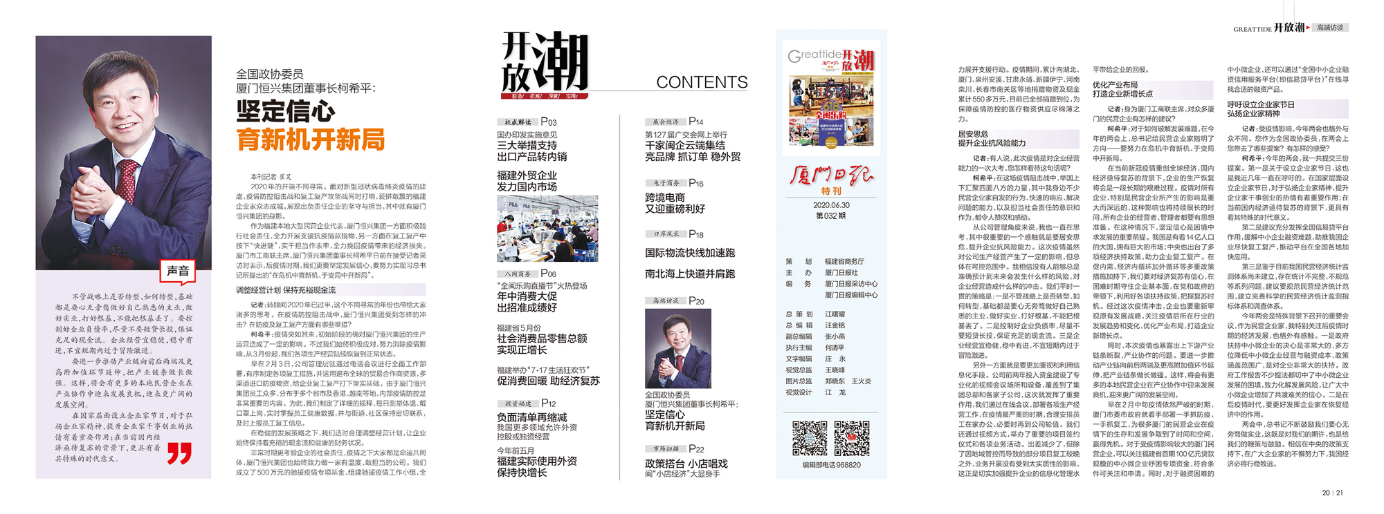 作為福建本地大型民營企業(yè)代表,廈門恒興集團一方面積極踐行社會責(zé)任,全力開展支援抗疫捐款捐物,另一方面在復(fù)工復(fù)產(chǎn)中按下“快進鍵”,實干擔(dān)當(dāng)作表率,全力挽回疫情帶來的經(jīng)濟損失。廈門市工商聯(lián)主席、廈門恒興集團董事長柯希平日前在接受記者采訪時表示,后疫情時期,我們更要堅定發(fā)展信心,要努力實現(xiàn)習(xí)總書記所提出的“在危機中育新機、于變局中開新局”。