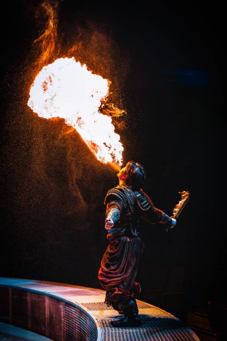 “本次升級(jí),我們采用“天幕地屏+激光投影”的立體舞臺(tái)設(shè)計(jì),打破了傳統(tǒng)演出的空間限制,給觀眾帶來(lái)前所未有的沉浸式體驗(yàn)?!睂?dǎo)演閔銳接受采訪時(shí)說(shuō),“《王的戰(zhàn)車》以北方部落的古老傳說(shuō)為藍(lán)本,將傳統(tǒng)技藝與現(xiàn)代科技巧妙融合。比如縵吊演員的表演象征著部落信仰的升華,而噴火表演則象征著勇士的熾熱斗志。整場(chǎng)演出既保留了傳統(tǒng)雜技的力量與驚險(xiǎn),又通過(guò)全息投影技術(shù)等科技手段賦予其全新的藝術(shù)表達(dá),希望觀眾在觀演的過(guò)程中,除了感受到震撼,也能體會(huì)到中國(guó)傳統(tǒng)文化的深厚底蘊(yùn)與傳承。